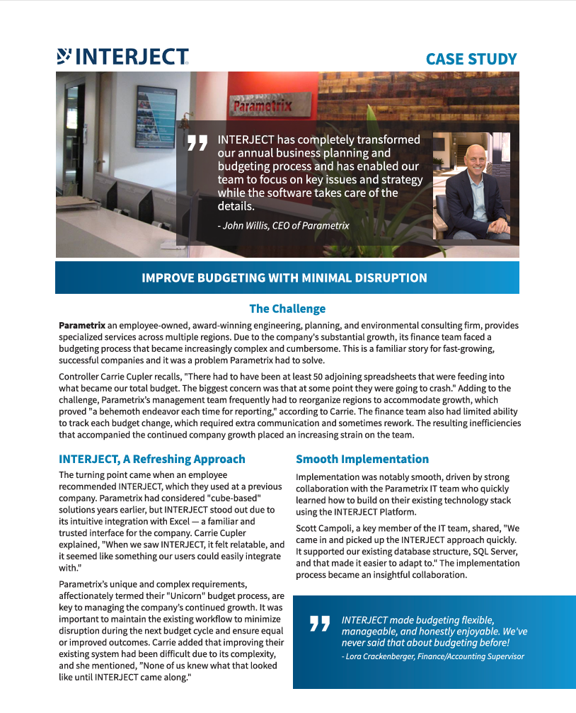 Parametrix replaced a tangled web of manual spreadsheets with Interject’s intuitive platform, streamlining budgeting, boosting accountability, and saving hundreds of hours each cycle.