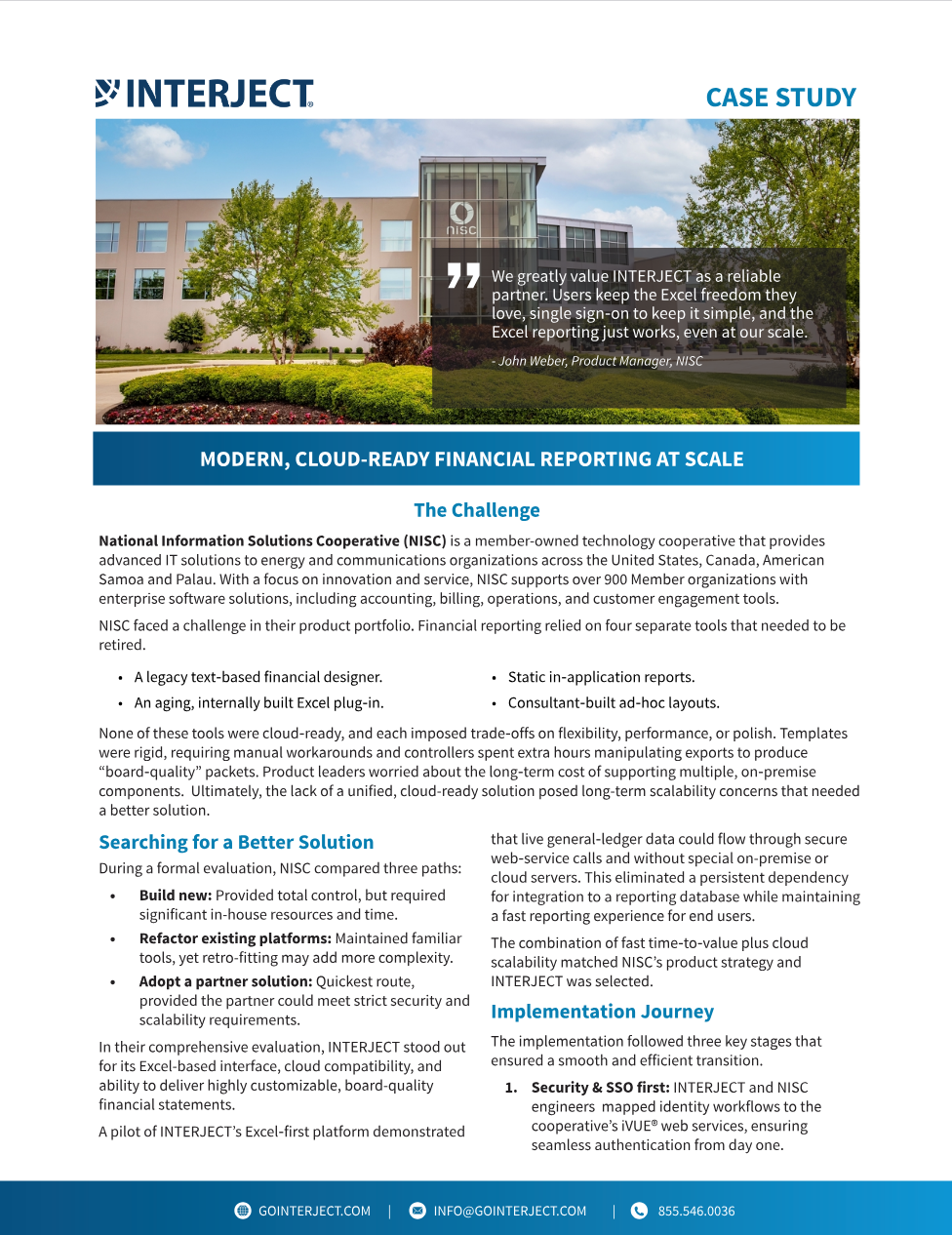 INTERJECT’s Excel-first, cloud-ready reporting cut NISC’s month-end close from days to hours, boosting accuracy, reducing support tickets, and eliminating legacy tool overhead.
